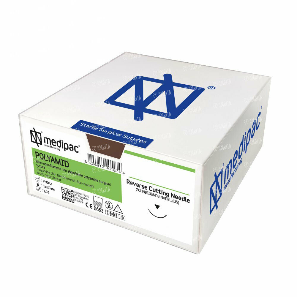 Шовный материал POLYAMID — монофиламентная нить 4/0 45 см, обратно-режущая игла 16 мм 3/8, 24 шт
