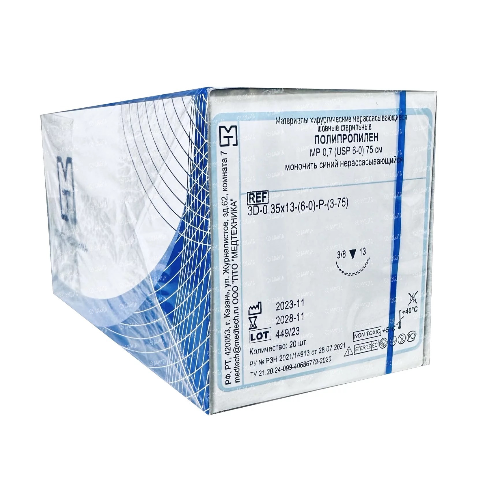 Шовный материал Полипропилен — монофиламентная нить 6/0 75 см, обратно-режущая игла 13 мм 3/8, 20 шт
