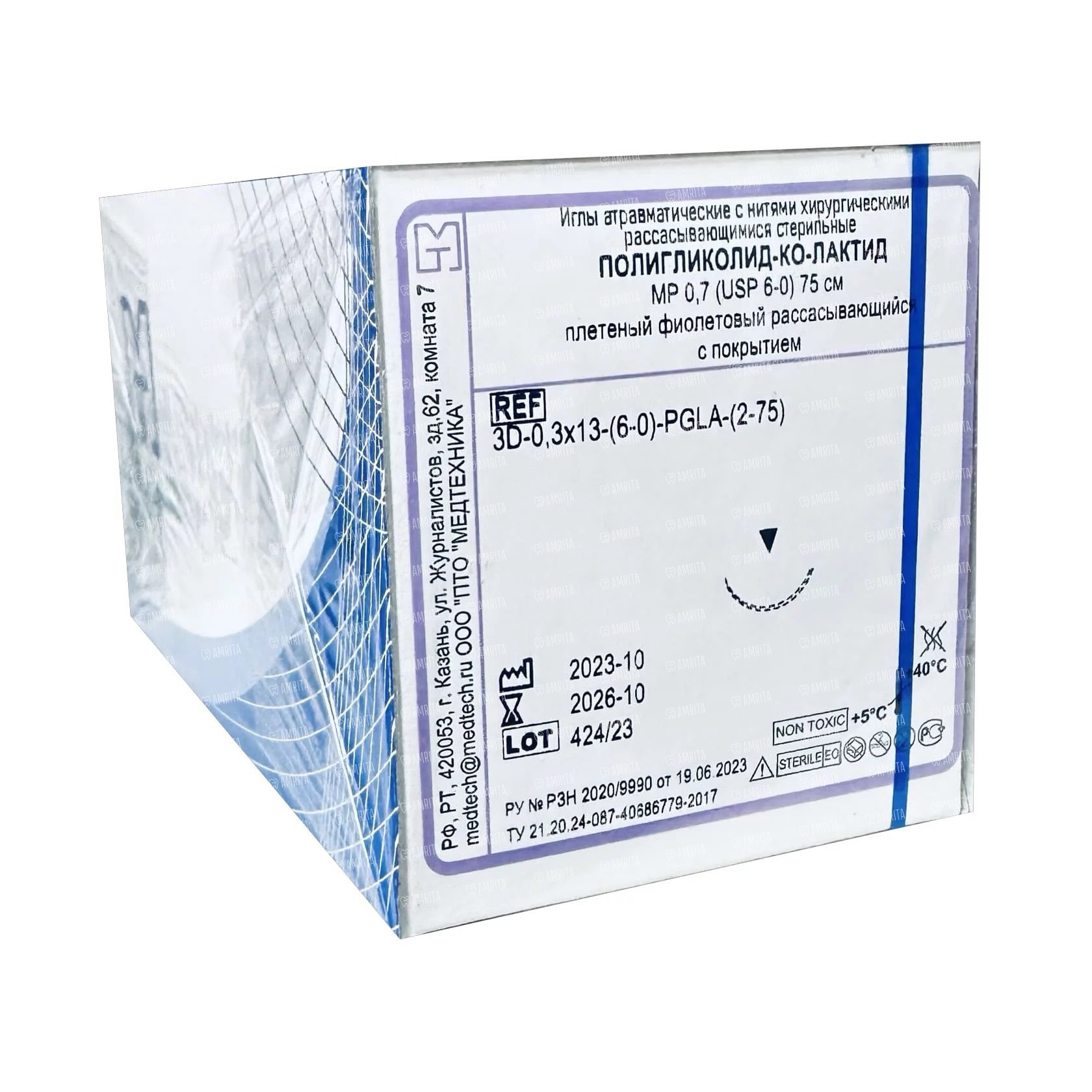 Шовный материал Полигликолид-ко-лактид — плетеная нить 6/0 75 см, обратно-режущая игла 13 мм 1/2, 20 шт