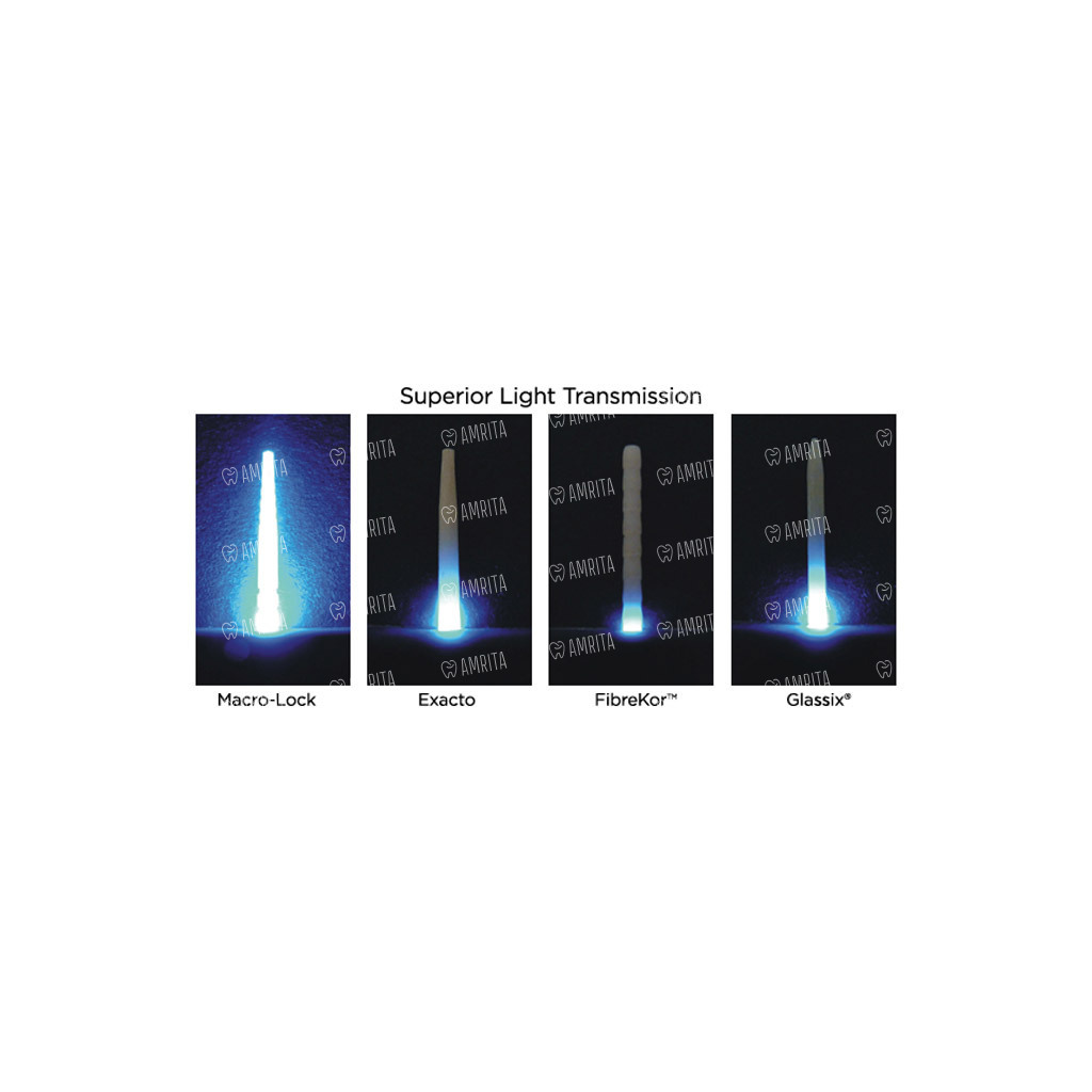 - Макро-ретенция без стресса для корня. Конструкция Macro-Lock имеет специальные макро-ретенционные насечки и два плоских среза на коронковой части, которые механически сцепляются с цементом и композитом, предотвращая ротацию и обеспечивая максимальную фиксацию. При этом коническая форма штифта анатомически соответствует каналу, позволяя сохранить больше дентина и избежать опасного расклинивающего напряжения.