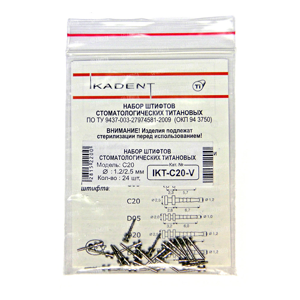 Штифт титановый внутриканальный Ikadent №C20, анкерный, пассивный, для реставрации коронки зуба, D=2.5/1.2 мм, L=2.8/6.7 мм, 24 шт + 3 инструмента и ключ