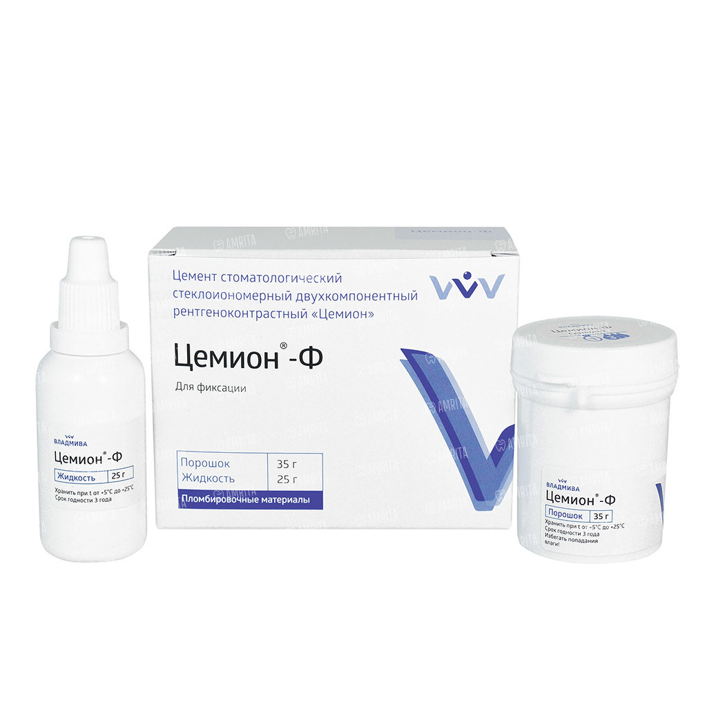 Цемент «Цемион-Ф» образуется при смешивании порошка и жидкости. Порошок представляет собой измельченное алюмофторсиликатное стекло, жидкость — водный раствор полиакриловой кислоты.