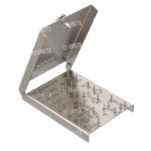 Кассета-укладка изготовлена из титана, имеет прямоугольную форму размером 112х82 мм. Применяется для стерилизации низкопрофильных пластин.