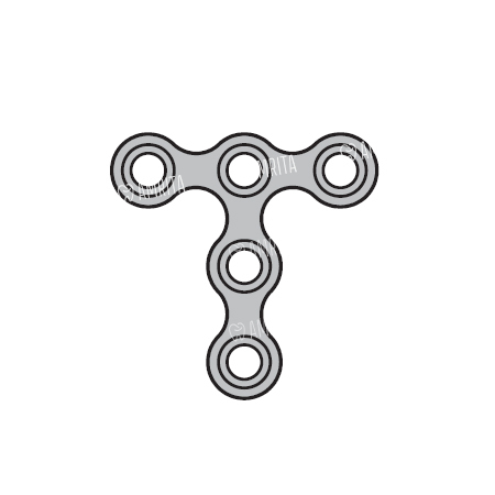 Короткая мини-пластина Конмет толщиной 0,6 мм изготовлена из титана, имеет Т-образную форму и 5 отверстий. Применяется для черепно-челюстно-лицевого остеосинтеза и костной пластики.