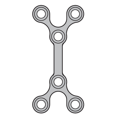Длинная мини-пластина толщиной 1 мм изготовлена из титана, имеет Х-образную форму и 6 отверстий. Применяется для черепно-челюстно-лицевого остеосинтеза и костной пластики.