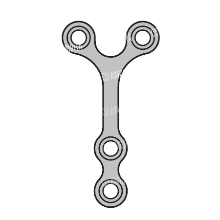 Длинная мини-пластина Конмет толщиной 0,6 мм изготовлена из титана, имеет Y-образную форму и 4 отверстия. Применяется для черепно-челюстно-лицевого остеосинтеза и костной пластики.