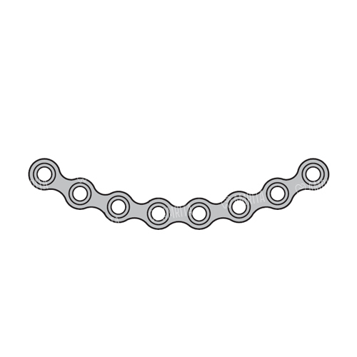 Мини-пластина низкопрофильная толщиной 0,6 мм изготовлена из титана, имеет С-образную форму и 8 отверстий. Применяется для черепно-челюстно-лицевого остеосинтеза и костной пластики.