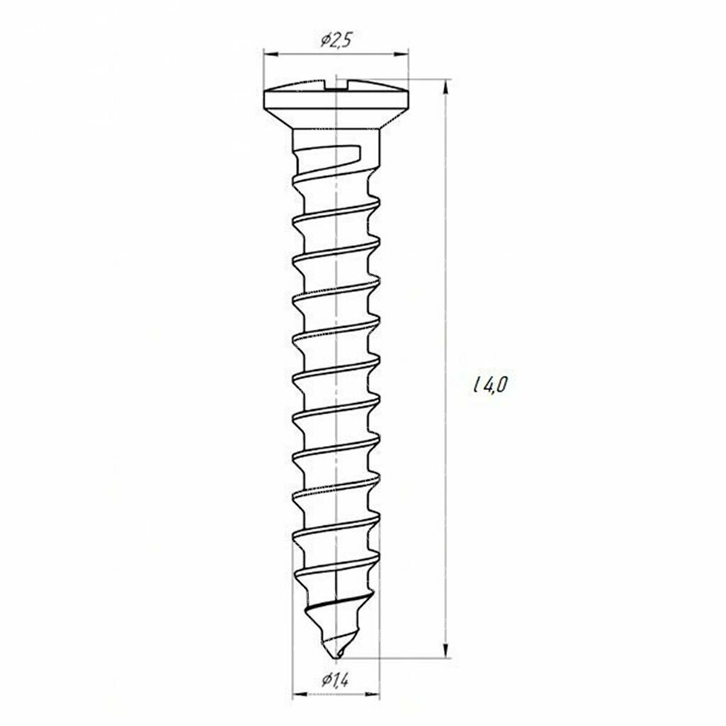 - Прецизионные размеры для высокой точности. Диаметр стержня 1.4 мм в сочетании с компактной головкой 2.5 мм позволяет устанавливать винты в условиях дефицита пространства, обеспечивая при этом надежное прижатие кортикальной пластины к принимающему ложу.