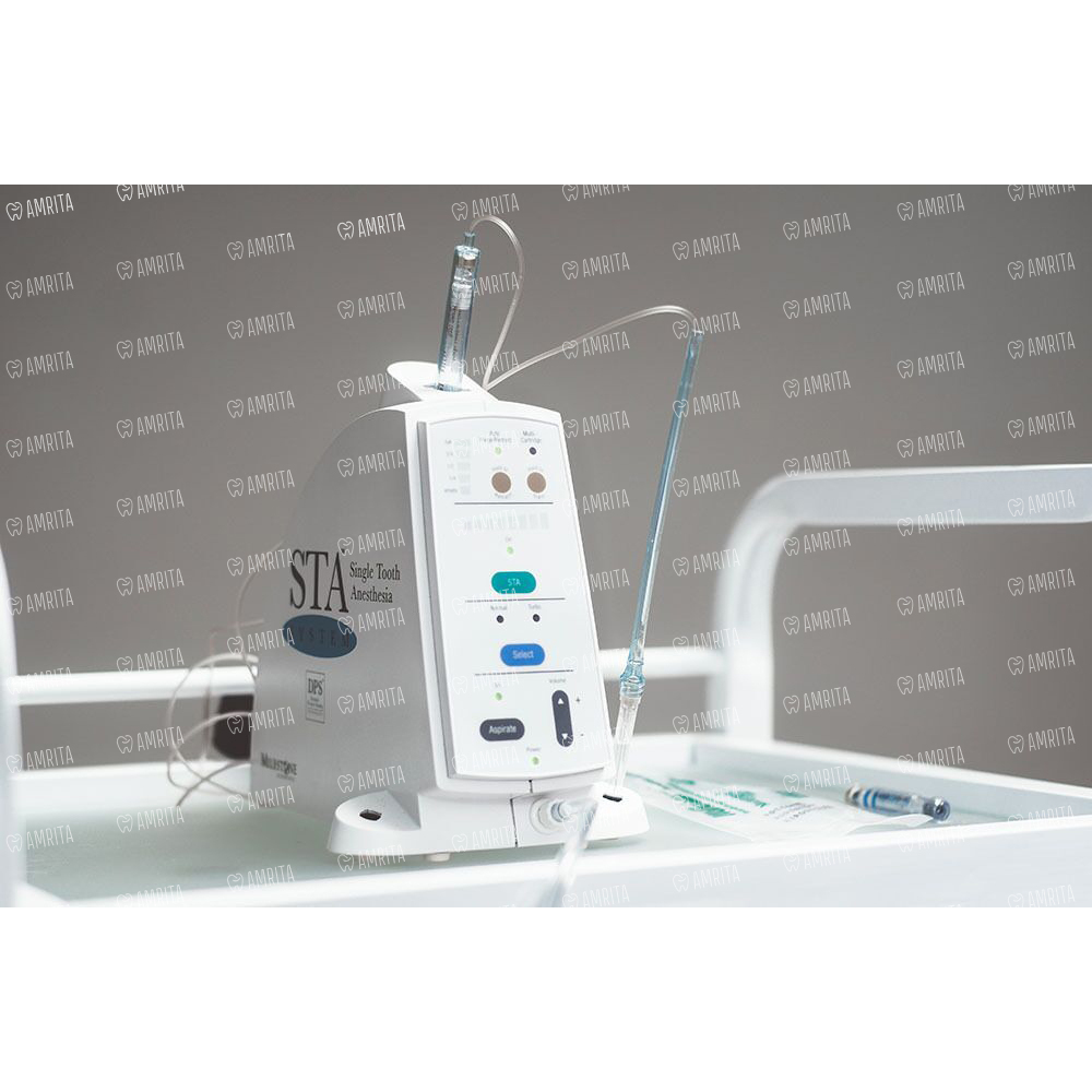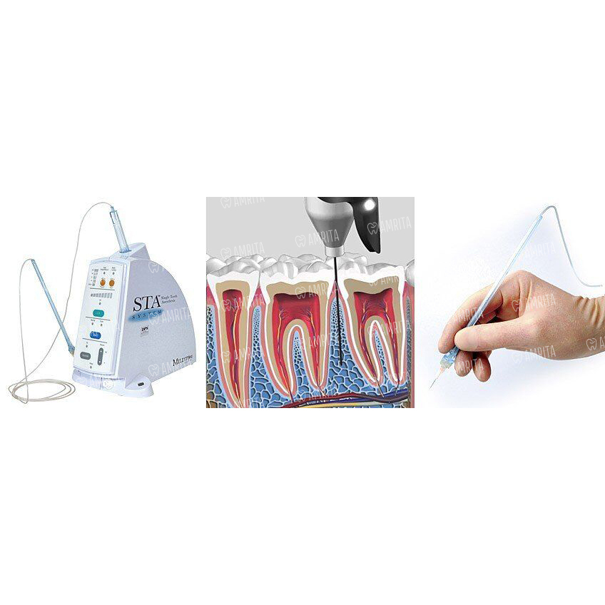 Использование технологии динамического контроля за давлением в системе CompuDent STA — «Single Tooth Anesthesia» позволяет добиться глубокого обезболивания одного зуба в качестве альтернативы проводниковой анестезии, а также обезболивания нескольких зубов без сопутствующего коллатерального онемения губ и мягких тканей лица.