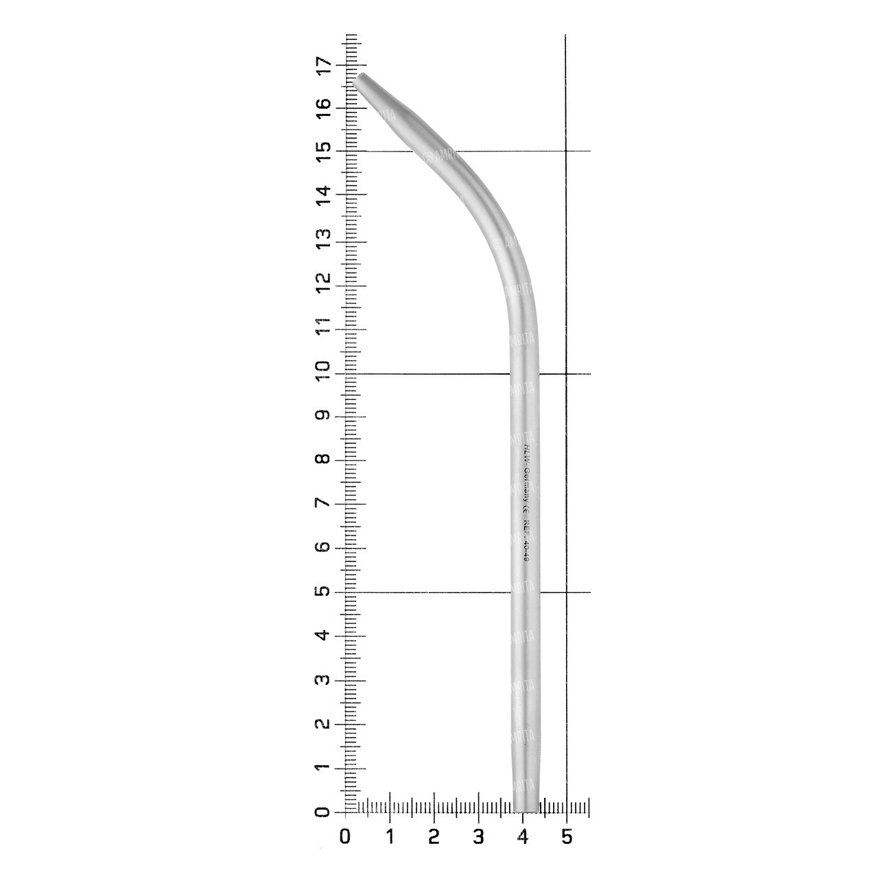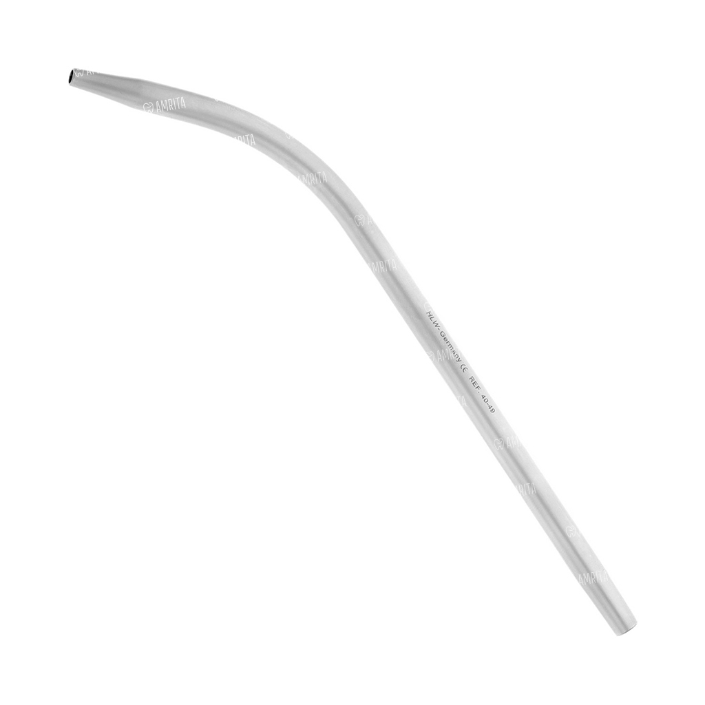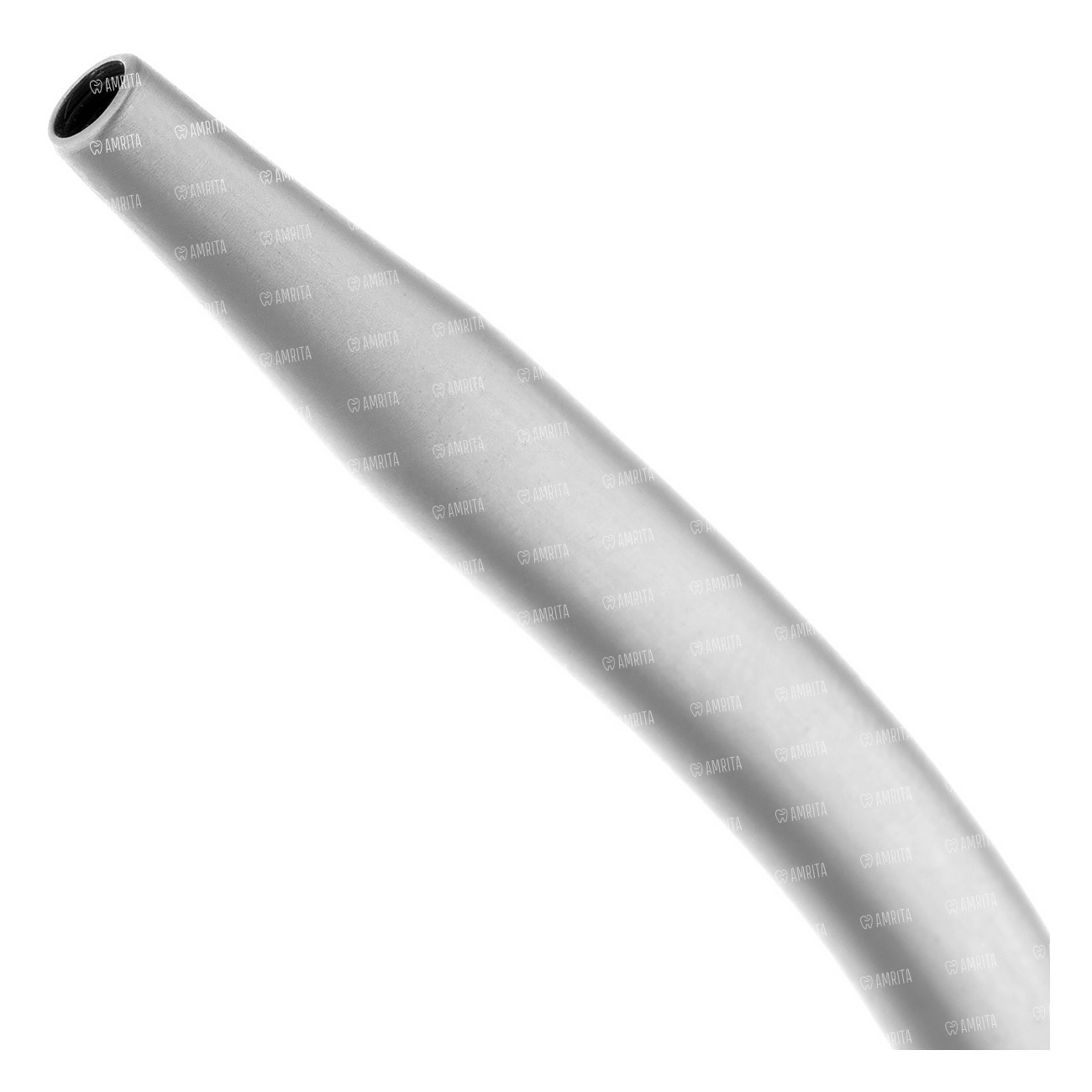 Слюноотсос металлический изогнутый по ребру. Максимальная ширина рабочей части не более 3 мм. Максимальная ширина самой трубки не более 5 мм. На изгибе имеет мелкое отвертие служащее в качестве предохранителя. Поверхность матовая.
