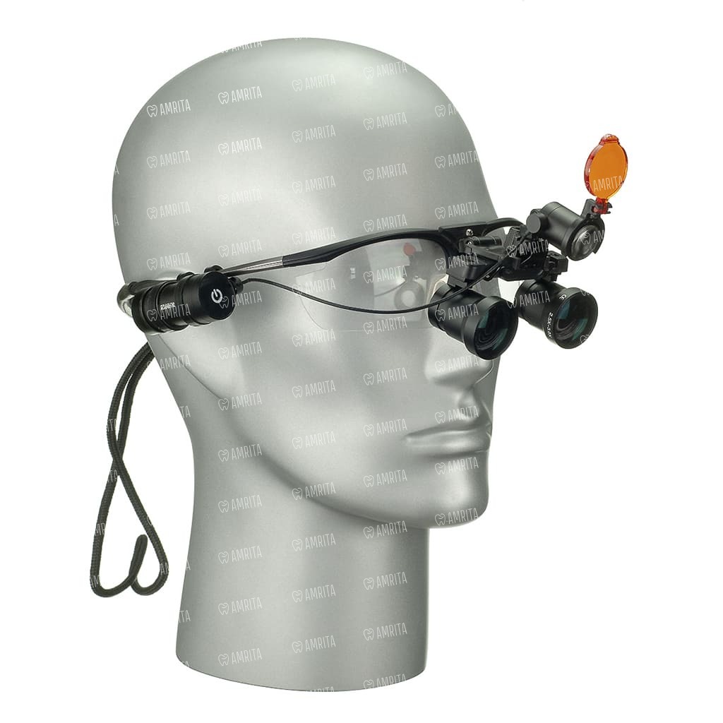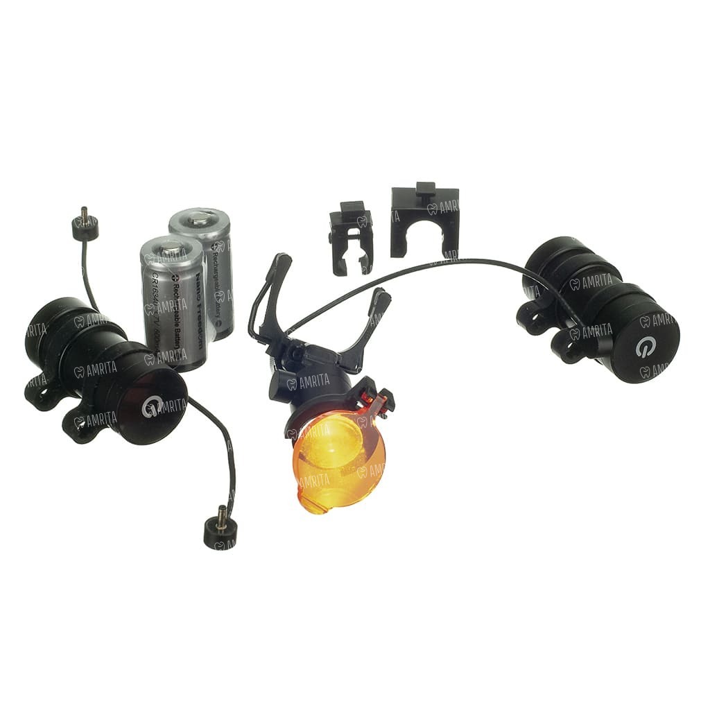- Аккумулятор крепится на дужке оправы очков и коротким прочным тефлоновым проводом соединяется с модулем, никакие провода не мешают в работе;