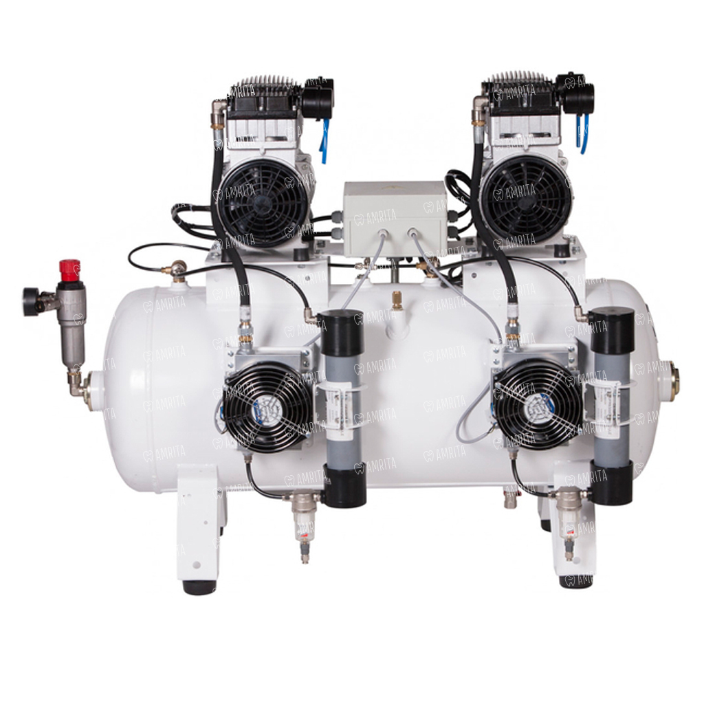 - Компрессор снабжен осушителем мембранного типа для очистки сжатого воздуха. Исполнение «Тандем», два узла насоса на одном ресивере.