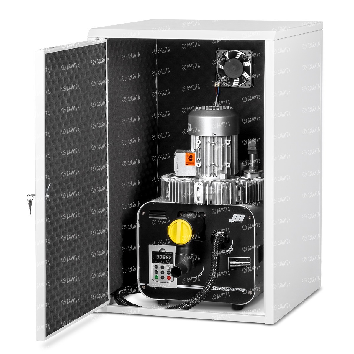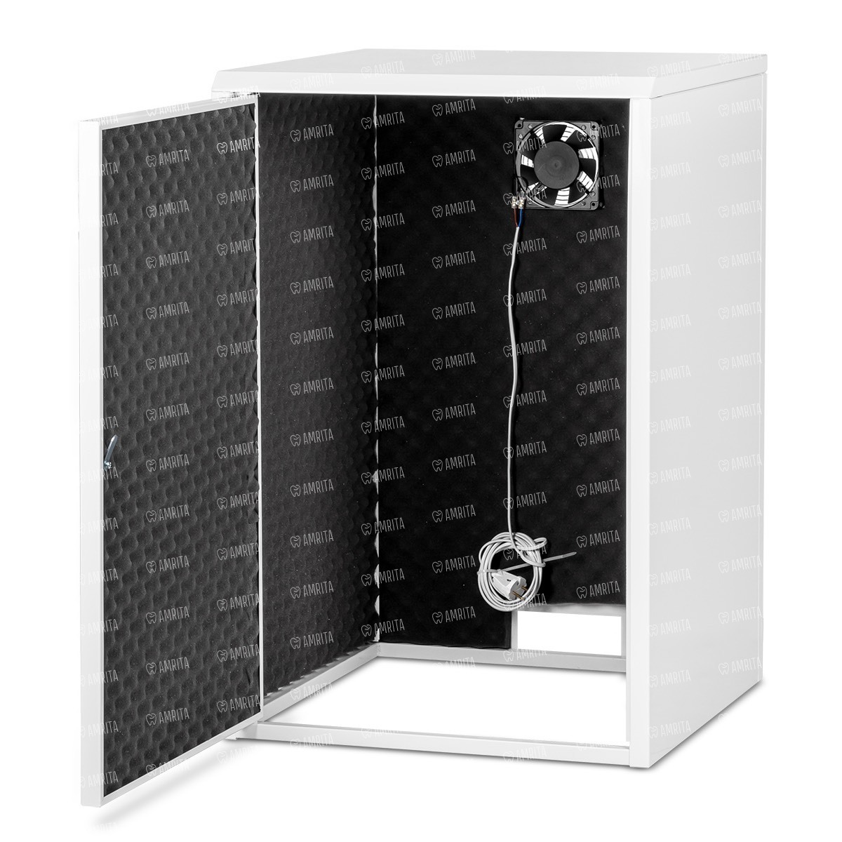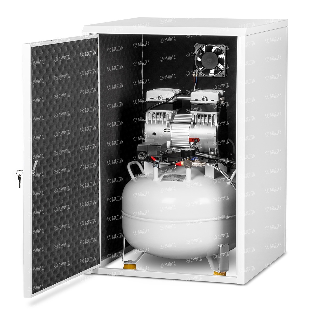 Кожух шумопоглощающий. Изготовлен из металла толщиной 1 мм, покрыт полимерно-порошковой краской белого цвета. Изнутри изделие проклеено шумопоглощающим материалом — пенополиуретаном. Для лучшей циркуляции воздуха внутри размещён вентилятор. Конструкция сборно-разборная, что позволяет существенно сократить транспортные расходы покупателя. Дверца упрощает доступ к компрессору с целью обслуживания.