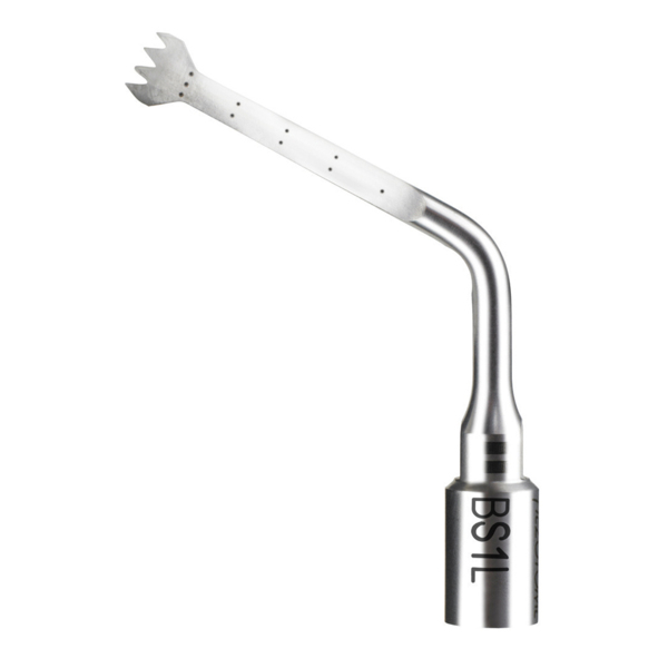 Насадка BS1L II (Long) для аппаратов Piezotome II, IC2, PZT Solo. Ультра острая, тонкая и длинная пила, оснащенная четырьмя специально заточенными зубчиками, предназначена для облегчения забора костных блоков из области ветви нижней челюсти. Глубина разреза: 15 мм.
