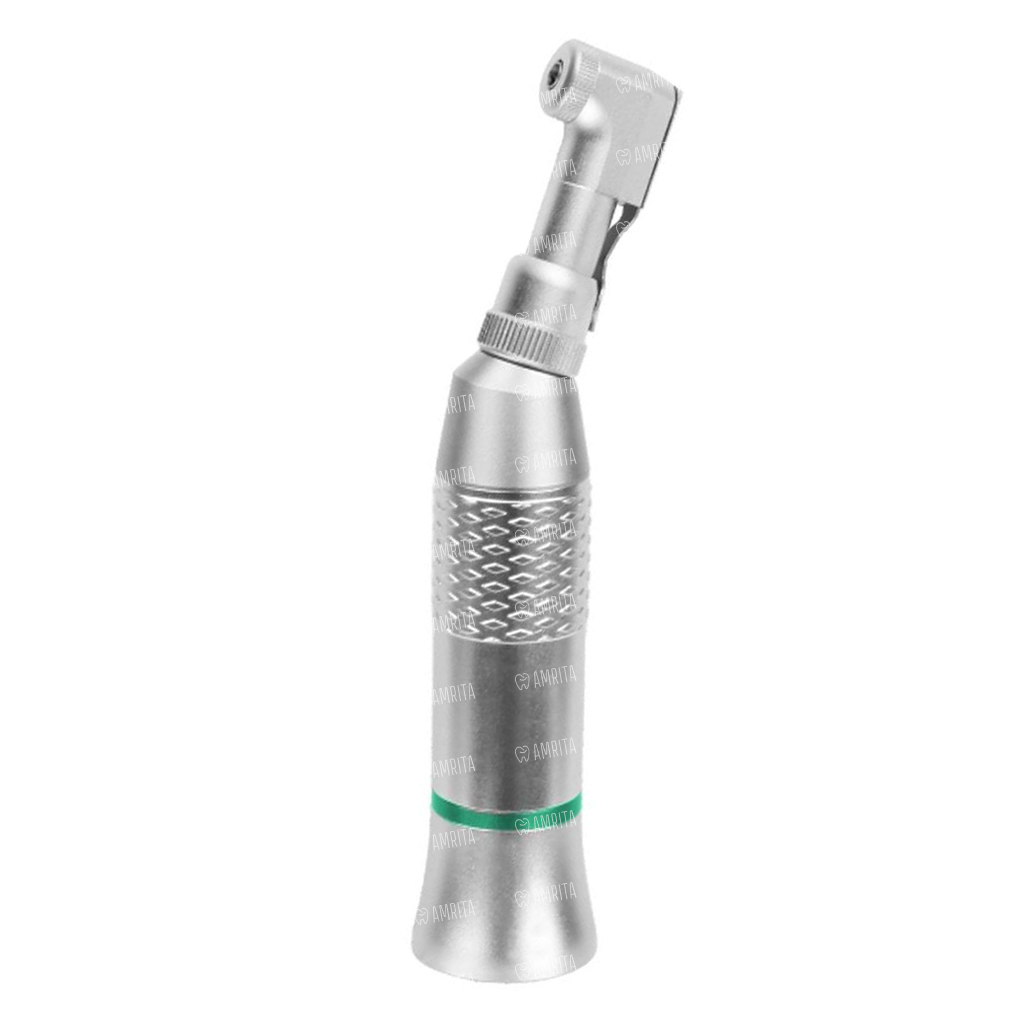Угловой стоматологический наконечник CX245-1A подходит для использования в терапевтической и ортопедической стоматологии. Диаметр хвостовика используемых с этим наконечником боров должен быть равен 2,35 мм. Угловой стоматологический наконечник CX245-1A, как и аналогичные низкоскоростные инструменты, работает от пневматического или электрического микромотора. Этот инструмент может использоваться как со стационарными, так и с передвижными, переносными и портативными стоматологическими установками. CX245-1A способен задавать бору скорость вращения до 40 000 оборотов в минуту. Кольцо зеленого цвета на угловом наконечнике означает, что он понижающий. В данном случае, инструмент имеет редукцию 4:1. Зажим на защелку позволяет быстро и без использования дополнительных предметов закрепить бор в головке инструмента.