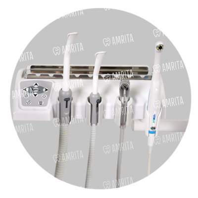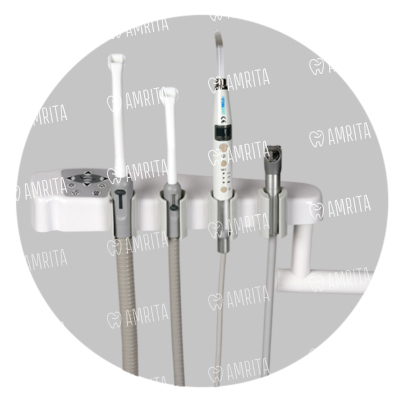 - Блок врача на пять инструментов. Установлено: пистолет вода/воздух/спрей, шланг электрического микромотора P2ED460, шланг турбинный четырёхканальный Midwest с подсветкой, два свободных места