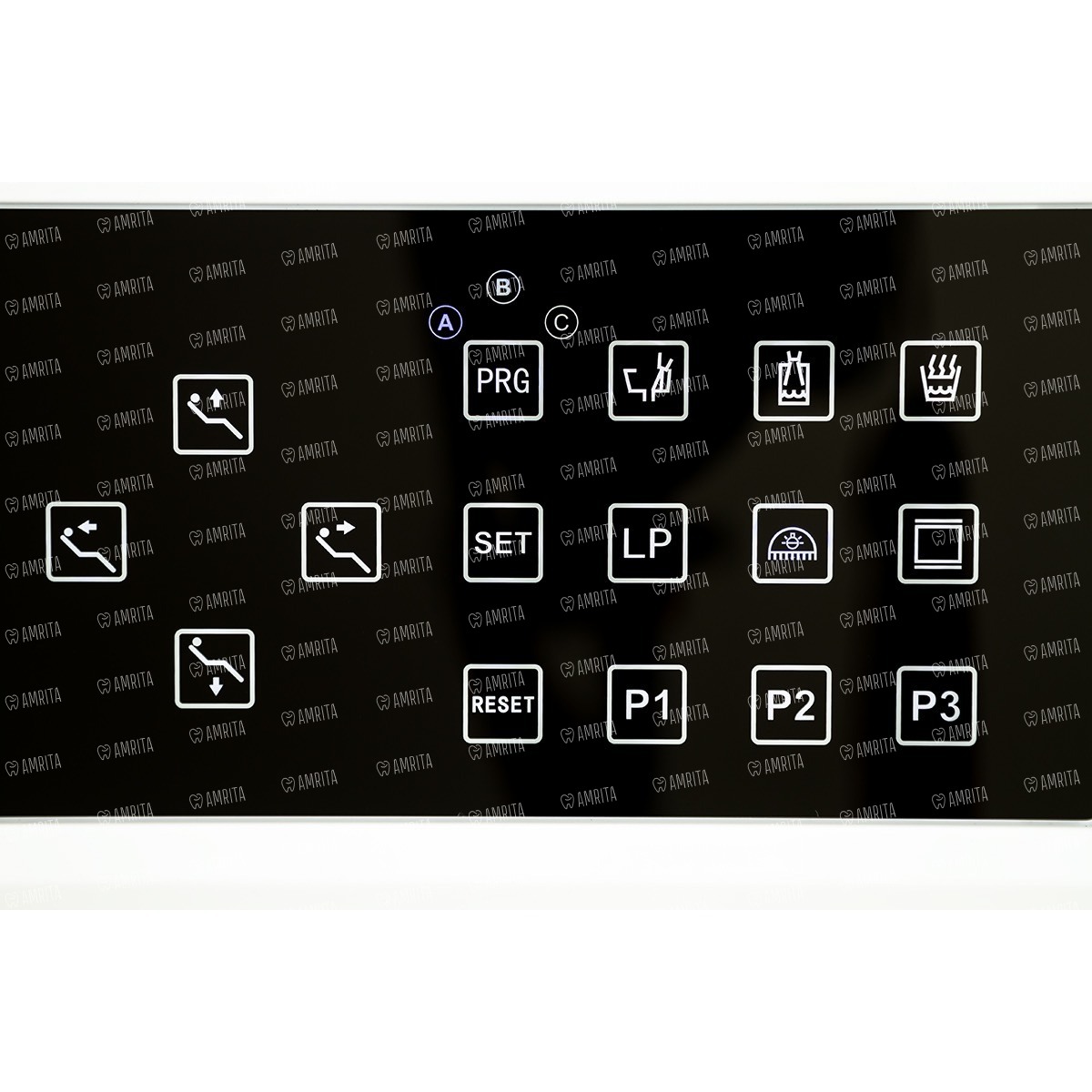 - Сенсорный блок управления креслом и плевательницей. Большой негатоскоп позволяет читать ортопантомограммы. 3 выхода М4 и водовоздушный спрей. Подача инструментов низ