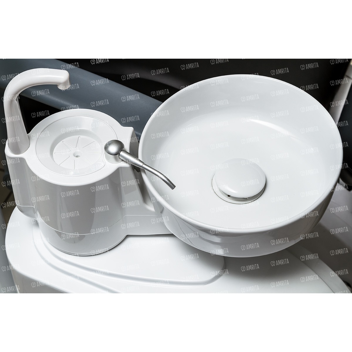 — Также блок врача оборудован специальной сенсорной панелью управления Touchscreen. Эжекторный гидроблок размещен на штанге светильника, вращается вокруг установки, очень удобен в использовании для правшей и левшей. В гидроблоке используются электроклапаны системы Asco, производства США, также встроены 2 емкости — для дистиллированной воды и для дезинфекции. - Плевательница