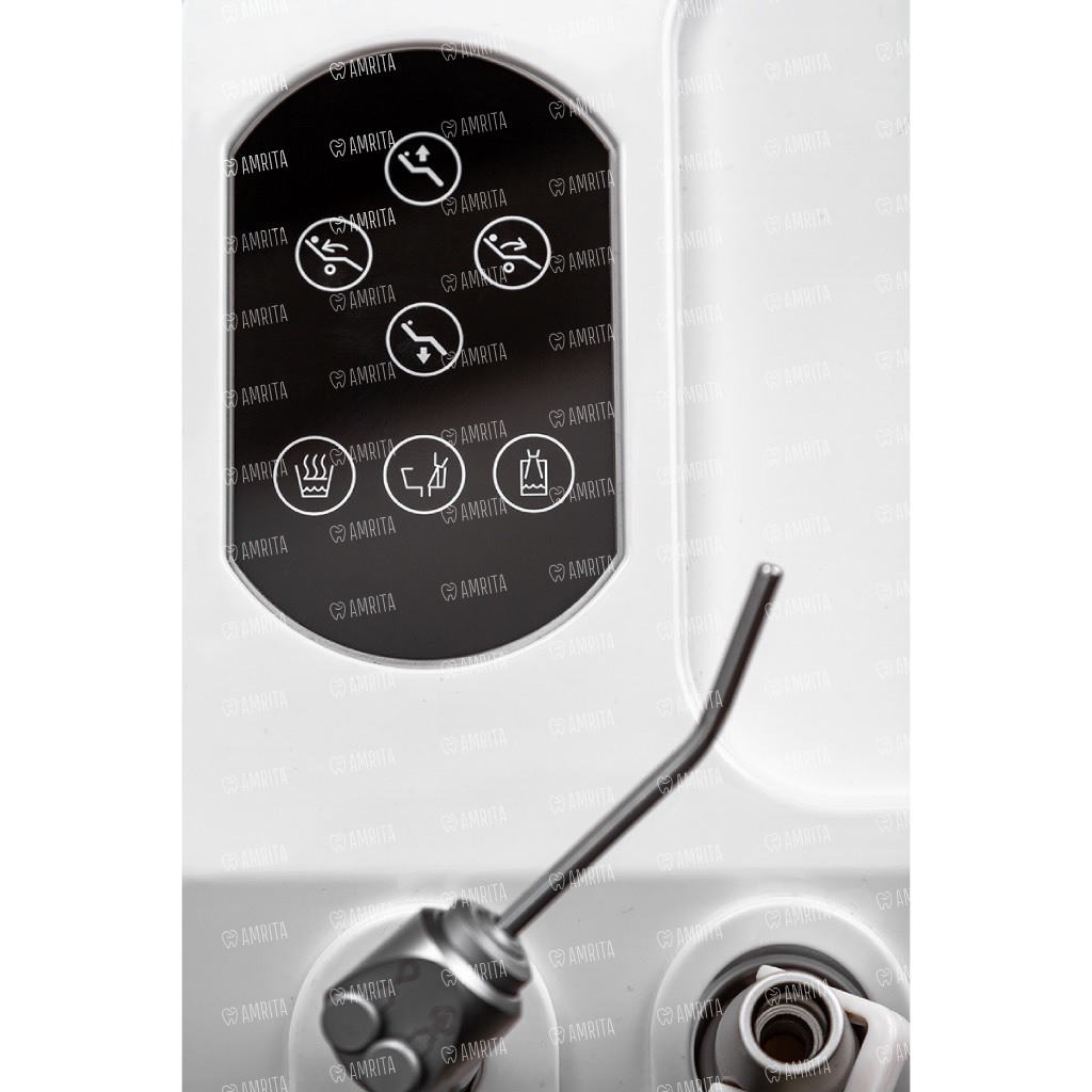 — Также блок врача оборудован специальной сенсорной панелью управления Touchscreen. Эжекторный поворотный крепится к креслу. В гидроблоке используются электроклапаны системы Asco, производства США, также встроены 2 емкости — для дистиллированной воды и для дезинфекции. - Плевательница