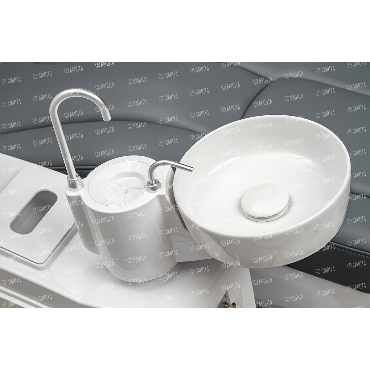 — Рассчитан на четыре инструмента, в базовой комплектации оснащен пылесосом, слюноотсосом, и пистолетом вода-воздух. - Плевательница