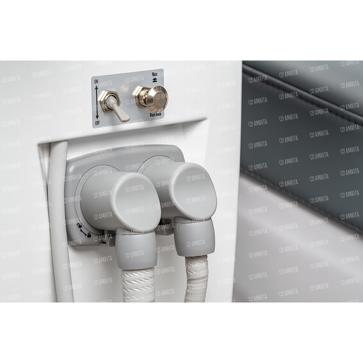 — Рассчитан на четыре инструмента, в базовой комплектации оснащен пылесосом, слюноотсосом, и пистолетом вода-воздух. - Плевательница