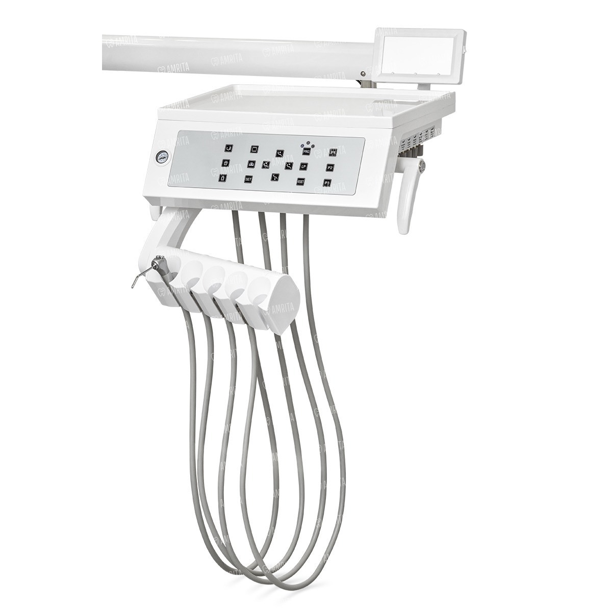 — Блок врача предполагает нижнюю подачу инструментов, оснащенных четырьмя выходами М4 и пистолет для подачи воздушно-водяной смеси. Нижняя подача инструментов популярная у стоматологов, которые предпочитают не тянуться за инструментом через пациента и не бороться с силой натяжения пружины. Также блок врача оборудован специальным сенсорным блоком управления (креслом, гидроблоком и другими инструментами), оснащен манометром давления. Также имеется пантограф с пневмотормозом рабочего положения. Приятным преимуществом является наличие негатоскопа для просмотра рентгеновских снимков. - Модуль ассистента на 4 инструмента