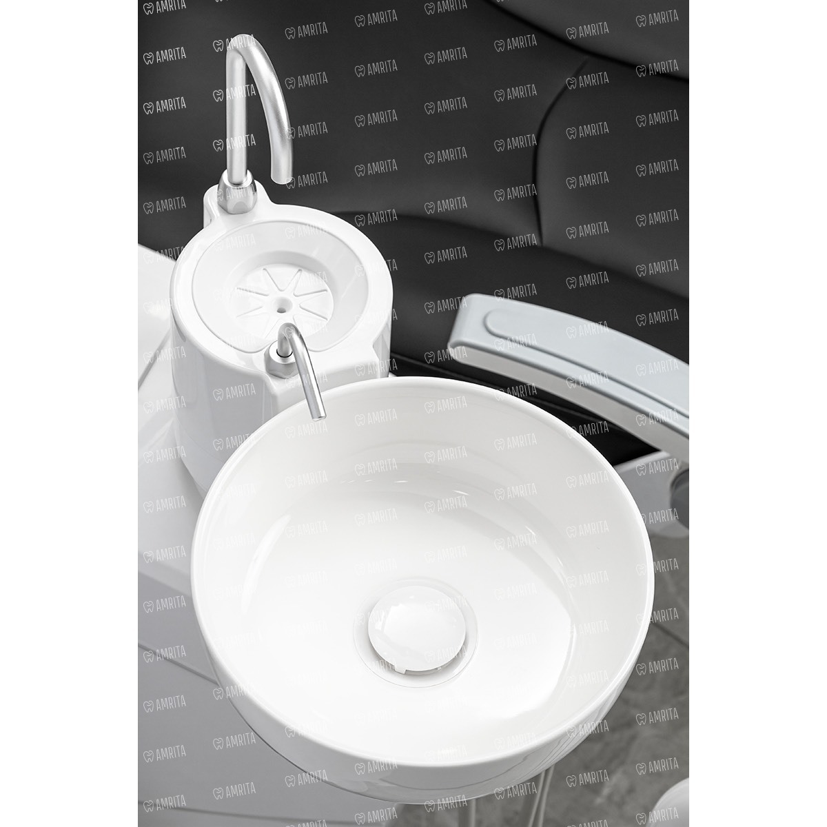 — Модуль ассистента рассчитан на четыре инструмента, в базовой комплектации оснащен пылесосом и слюноотсосом. В эжекторный гидроблок встроена емкость для дистиллированной воды, которая подается под давлением. Плевательница поворотная, угол 70 градусов, частично выполнена из фарфора, есть функция автоматического обмывания чаши и наполнения стакана. - Педаль управления