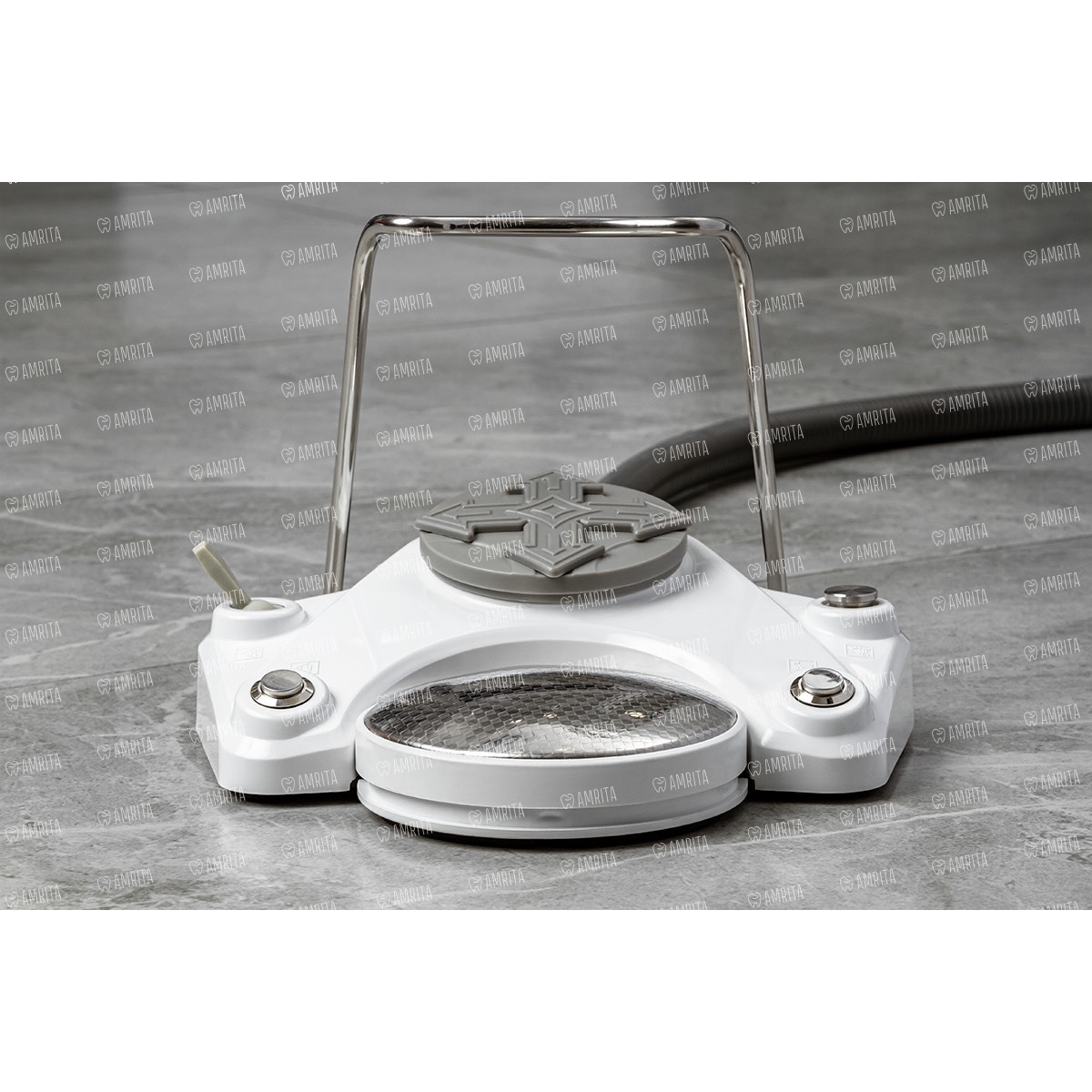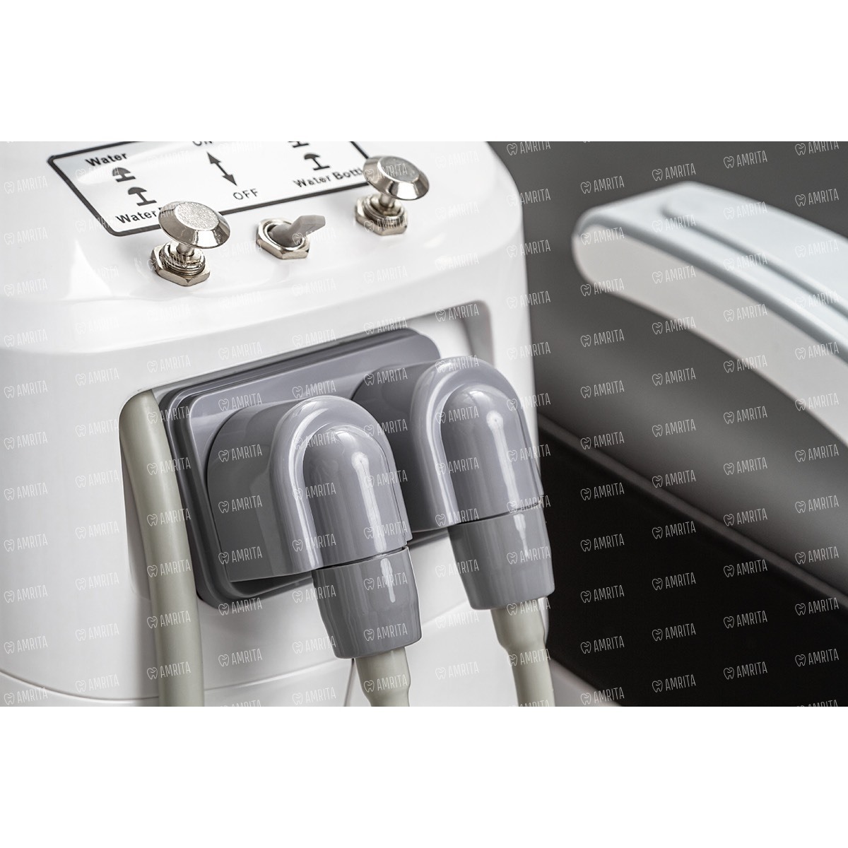 — Модуль ассистента рассчитан на четыре инструмента, в базовой комплектации оснащен пылесосом и слюноотсосом. В эжекторный гидроблок встроена емкость для дистиллированной воды, которая подается под давлением. Плевательница поворотная, угол 70 градусов, частично выполнена из фарфора, есть функция автоматического обмывания чаши и наполнения стакана. - Педаль управления