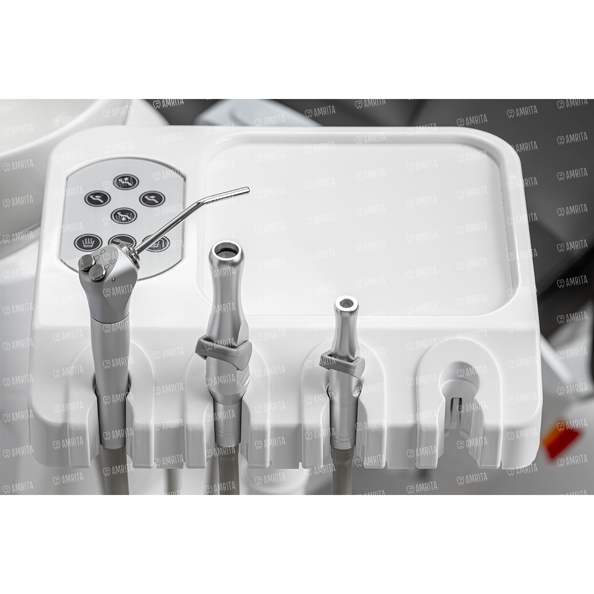 — Блок врача предполагает нижнюю подачу инструментов, оснащенных четырьмя выходами М4 и пистолет для подачи воздушно-водяной смеси. Нижняя подача инструментов популярная у стоматологов, которые предпочитают не тянуться за инструментом через пациента и не бороться с силой натяжения пружины. Также блок врача оборудован специальным сенсорным блоком управления (креслом, гидроблоком и другими инструментами), оснащен манометром давления. Также имеется пантограф с пневмотормозом рабочего положения. Приятным преимуществом является наличие негатоскопа для просмотра рентгеновских снимков. - Модуль ассистента на 4 инструмента