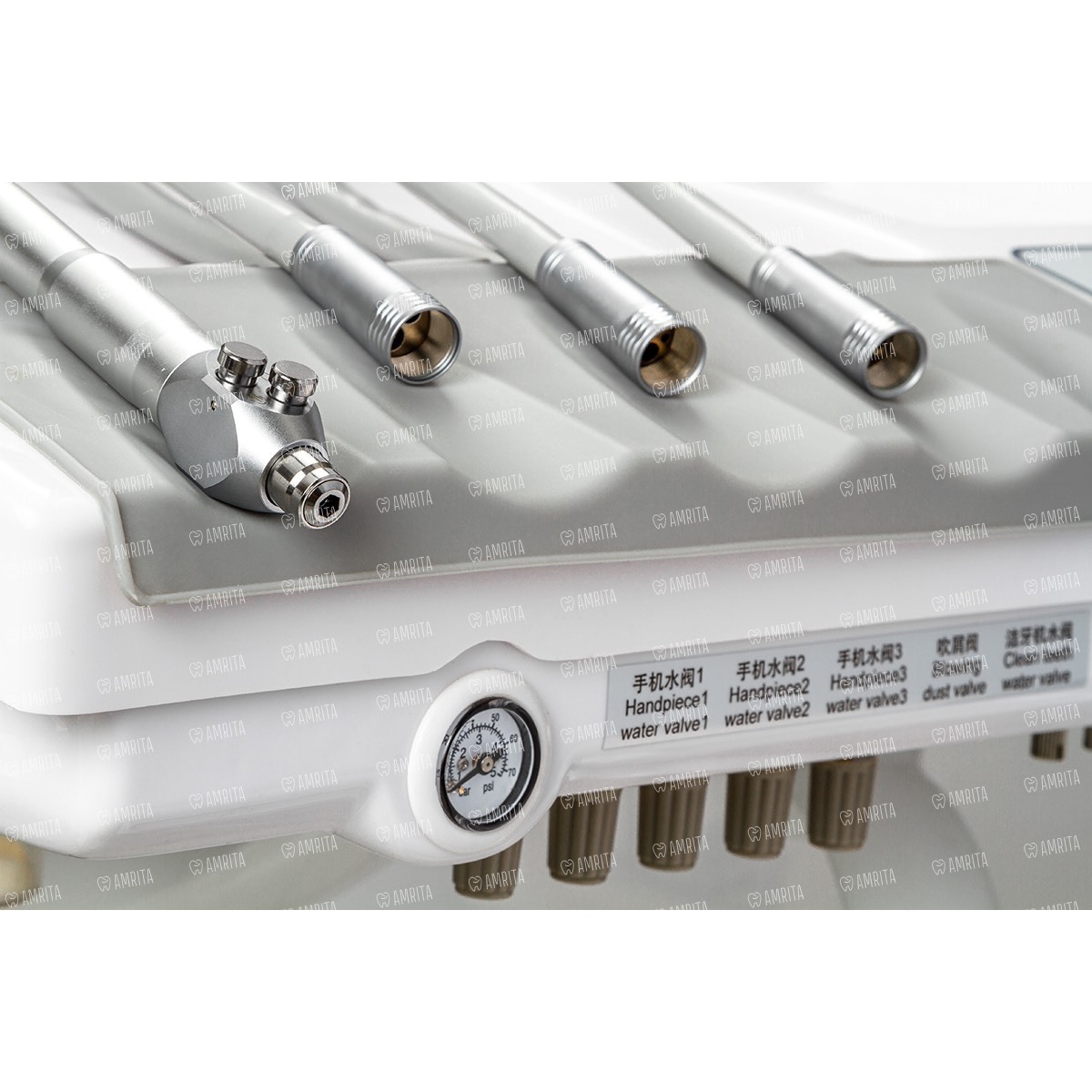 - Врачебный модуль имеет пантограф с пневмотормозом. Сенсорный блок управления креслом и плевательницей. Четыре выхода М4 и водовоздушный спрей