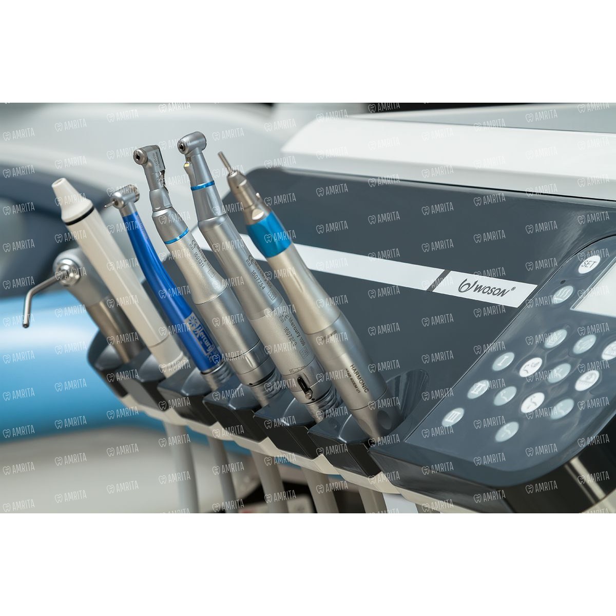 Многие стоматологи выбирают именно нижнюю подачу потому, что так пациент не видит инструментов и не испытывает напряжения. Кроме того, модуль располагается довольно низко и за инструментами не нужно далеко тянуться. Модуль врача рассчитан на 6 инструментов, он имеет пульт управления креслом. - Модуль ассистента