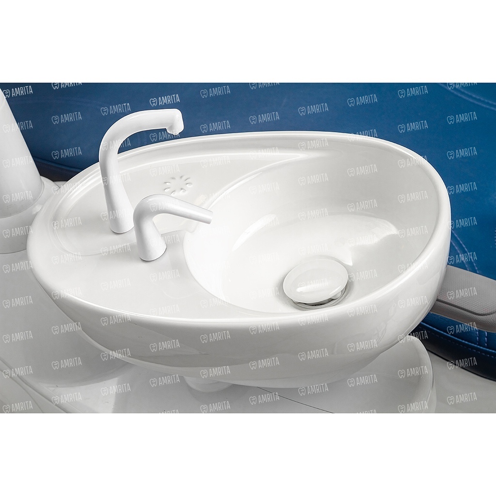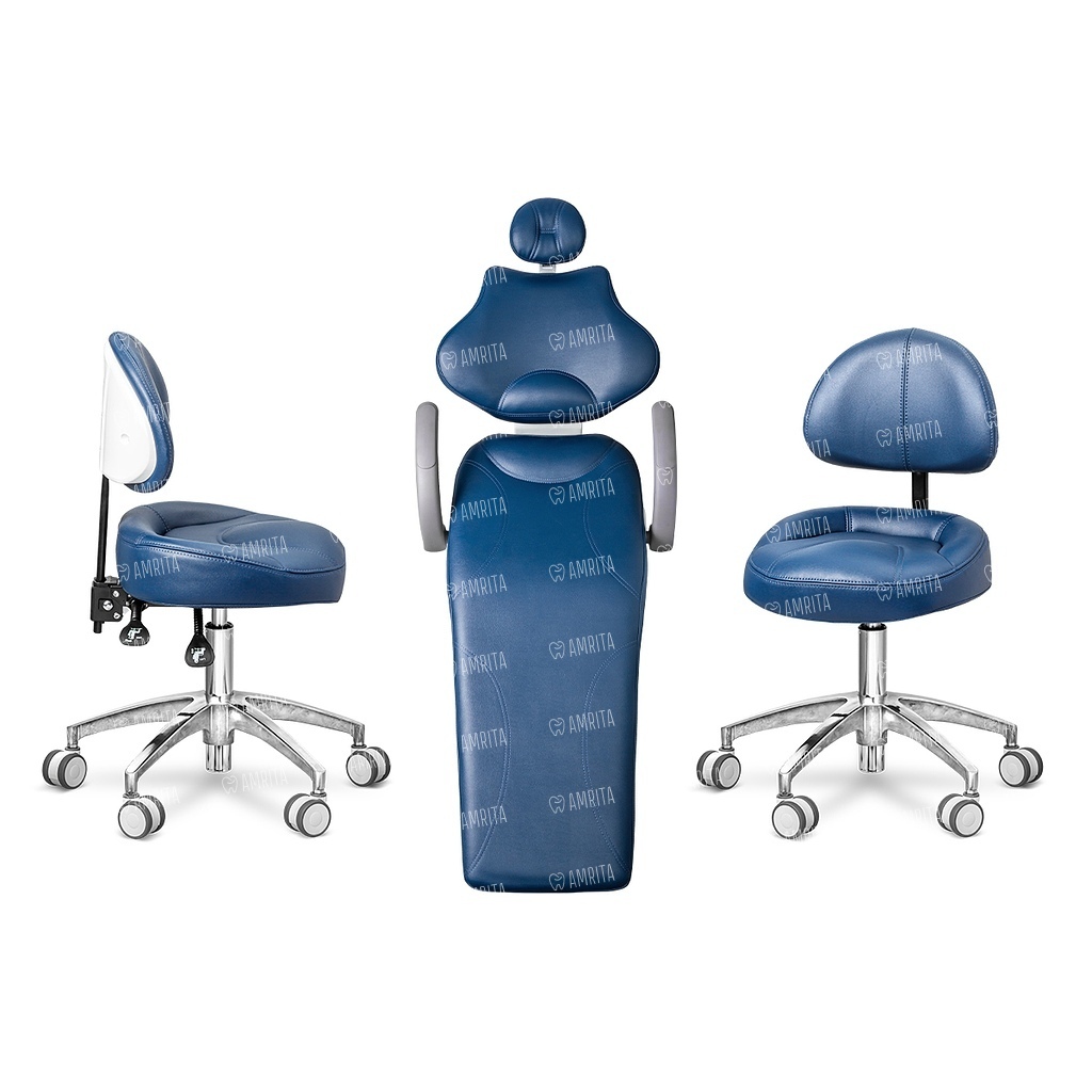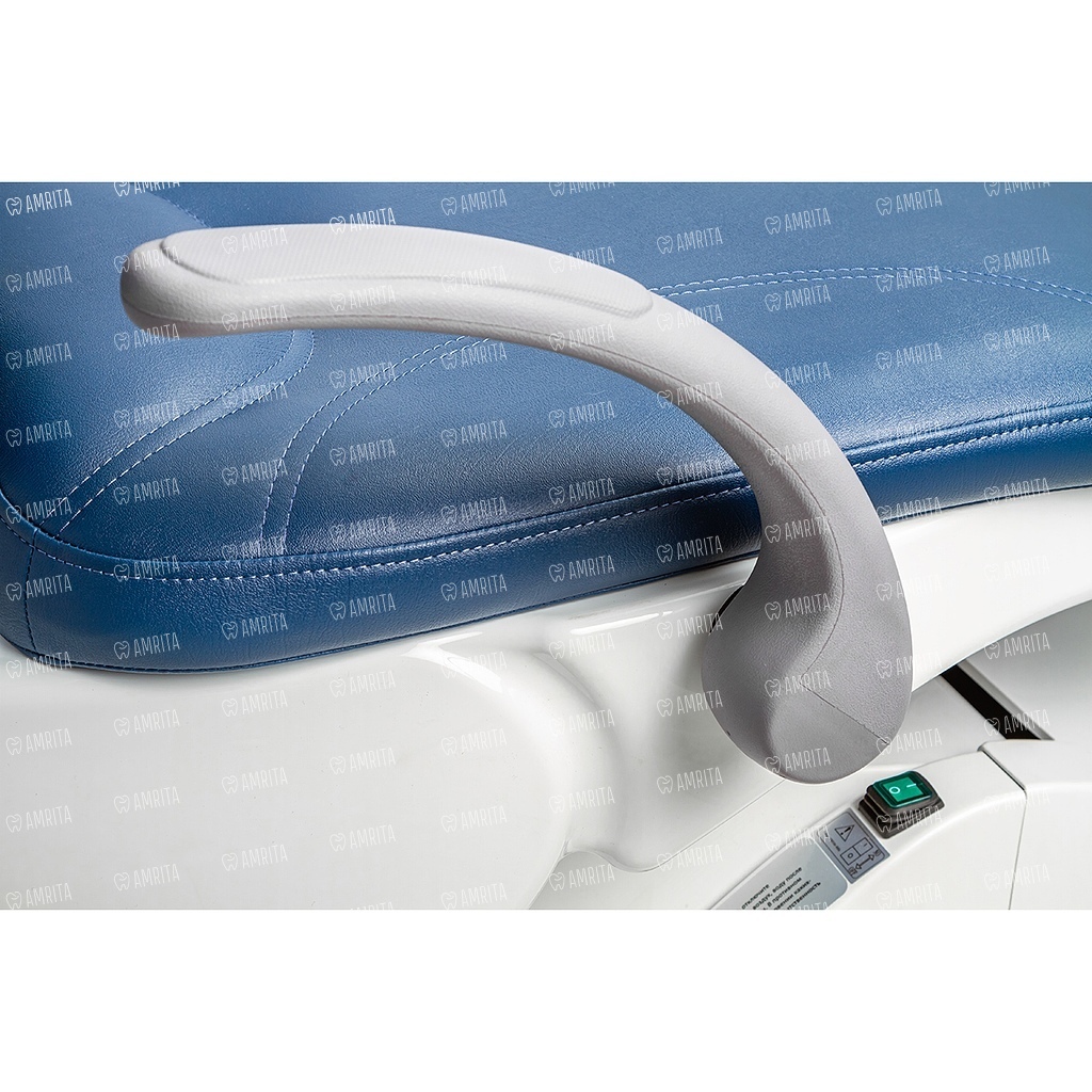 - Современное кресло пациента дополнено широкой спинкой с металлическим антивандальным основанием и шовной обивкой из импортной фиброкожи;