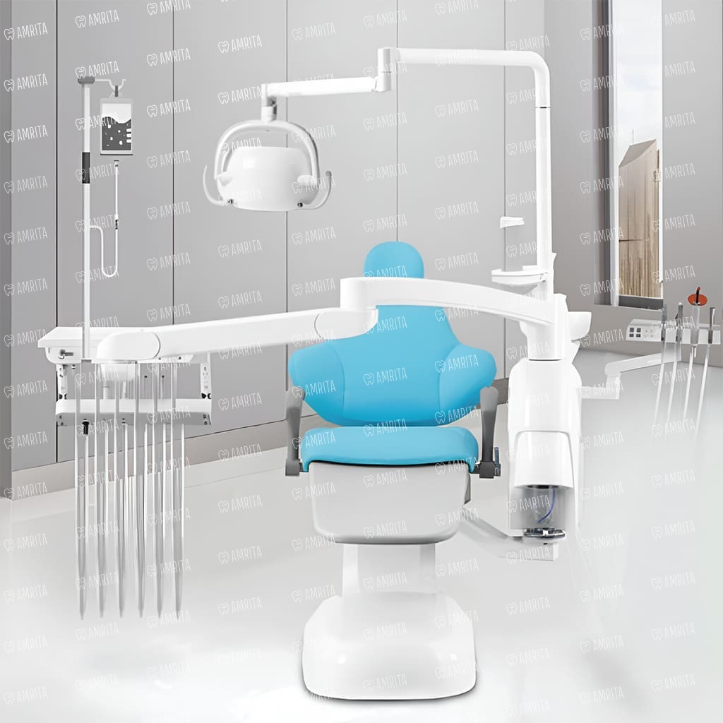 Стоматологическая установка X5 включает в себя кресло для пациента, подкатной блок для врача, гидроблок, светильник, блок для ассистента, стул врача. У установки есть функция проигрывание успокаивающей музыки через Bluetooth.