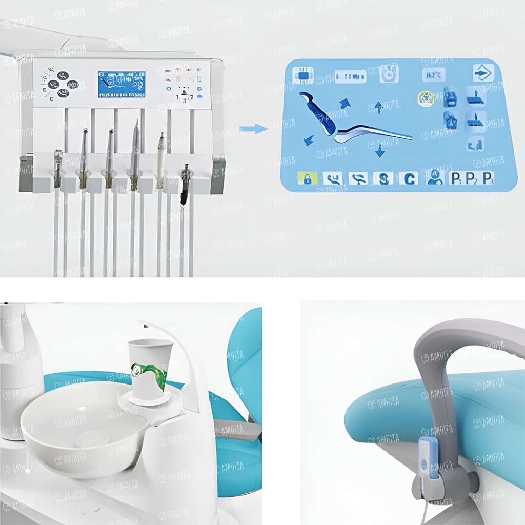 - Многофункциональный блок ассистента позволяет помощнику контролировать положение кресла, промывку плевательницы, нагрев воды и наполнение стаканчика водой;