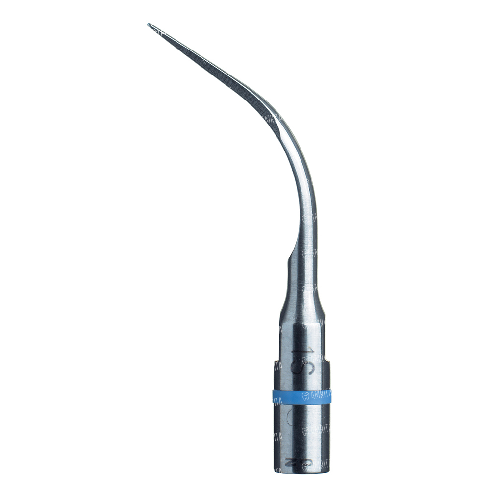- 10X, арт. F00359 — уплощенная, с сужающимся длинным кончиком, с одним изгибом на функциональном стержне небольшого радиуса. Максимально удобна при профессиональной гигиене, в широком спектре клинических ситуаций, с различной анатомической формой коронок зубов (выраженный экватор коронок, небольшой краудинг или средняя анатомическая норма). При пародонтологической нозологии (гипертрофический, фиброзный гингивит, пародонтит разной степени тяжести, пародонтальный абсцесс) может применятся в более глубоких карманах до 5 мм, с мягкотканной латеральной стенкой. Применяется для удаления зубных отложений на зубах крупного размера или для удаления крупных конгломератов твердых зубных отложений. Строго соблюдать режим мощности во избежание отлома кончика