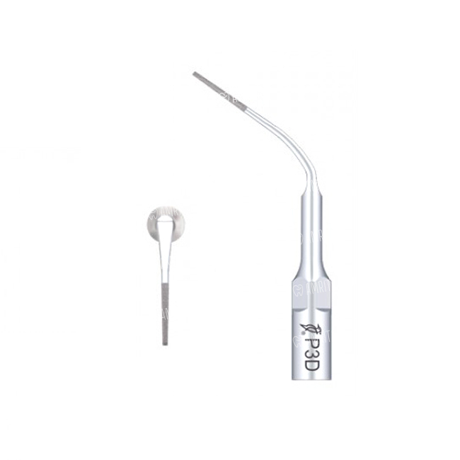 Пародонтологическая насадка P3D с алмазным покрытием (40 мкм) применяется для прикорневой очистки зубов после периодонтальной лоскутной хирургии. Также может использоваться для формирования краев коронки и для расширения фуркации зубов. Совместима со скалерами Woodpecker/EMS.