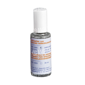 Специальный лак для индивидуальной модели, устойчивый ко всем изолирующим средствам. При одноразовом нанесении достигается толщина слоя около 8-16 микрон, благодаря чему образуется промежуточное пространство для цементирования коронок и мостовидных протезов. Дистанционный лак очень быстро высыхает, твердый и устойчивый к механическим воздействиям. Идеальный для использования при моделировании погружным методом или с помощью адепты.
