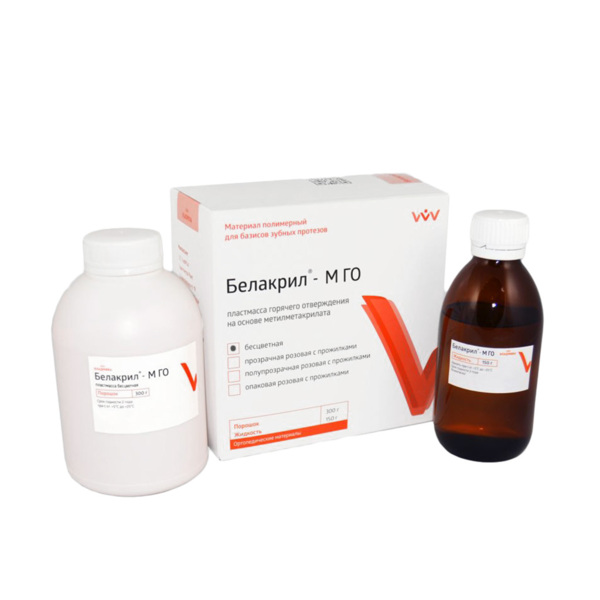 Базисные материалы «Белакрил» выпускаются в виде двух компонентов — порошка, содержащего полиэфиры метакриловой кислоты, катализатор реакции полимеризации перекись бензоила, и жидкости, содержащей мономер метилметакрилат (М) и/или мономер этилметакрилат (Э), после смешивания порошка с жидкостью образуется полимер, твердеющий при нагревании (горячего отверждения) — ГО или без нагревания (самотвердеющий) — ХО. Базисные материалы «Белакрил» отличает высокая технологичность, простота и быстрота изготовления изделий, имеющих высокое качество, функциональную долговечность, натуральный внешний вид и биосовместимость.