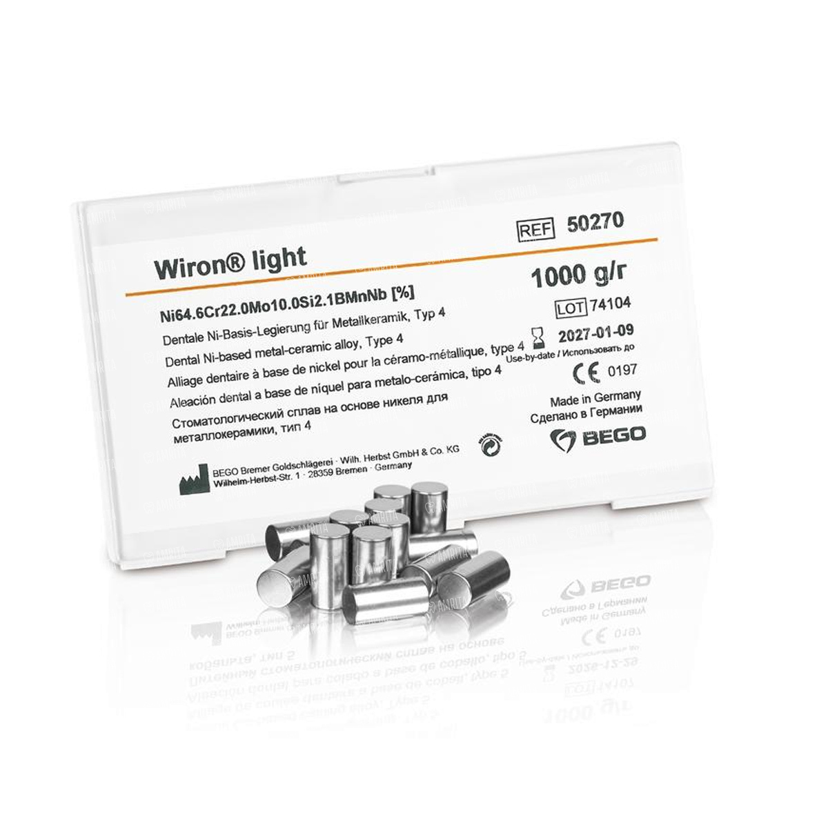 Неблагородный сплав Wiron light от производителя Bego для облицовки керамикой, со светлым оксидным слоем, без бериллия.