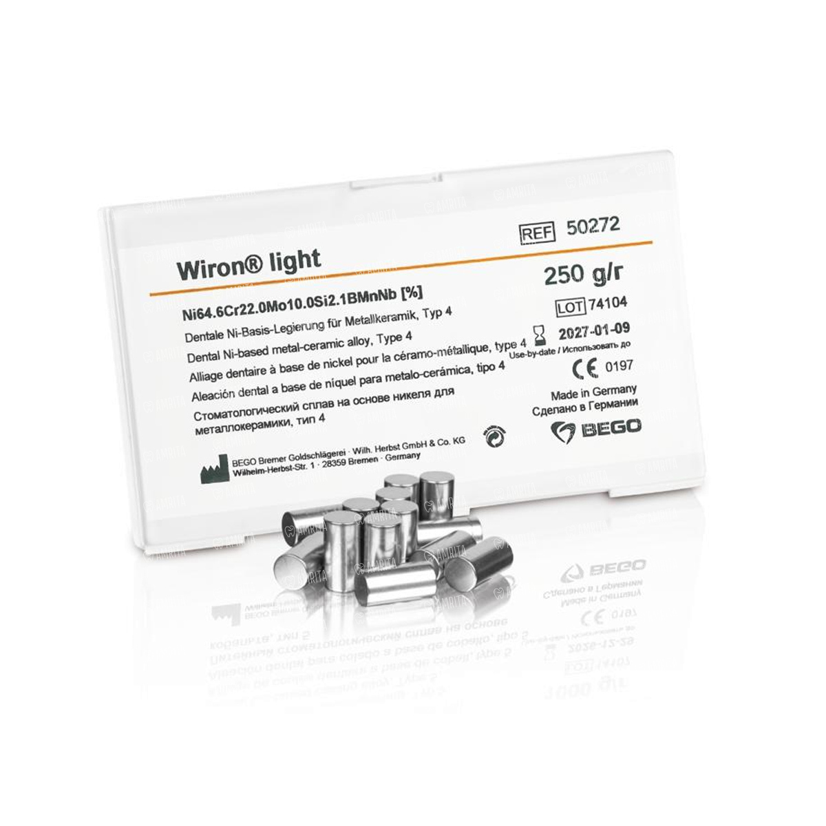 Неблагородный сплав Wiron light от производителя Bego для облицовки керамикой, со светлым оксидным слоем, без бериллия.